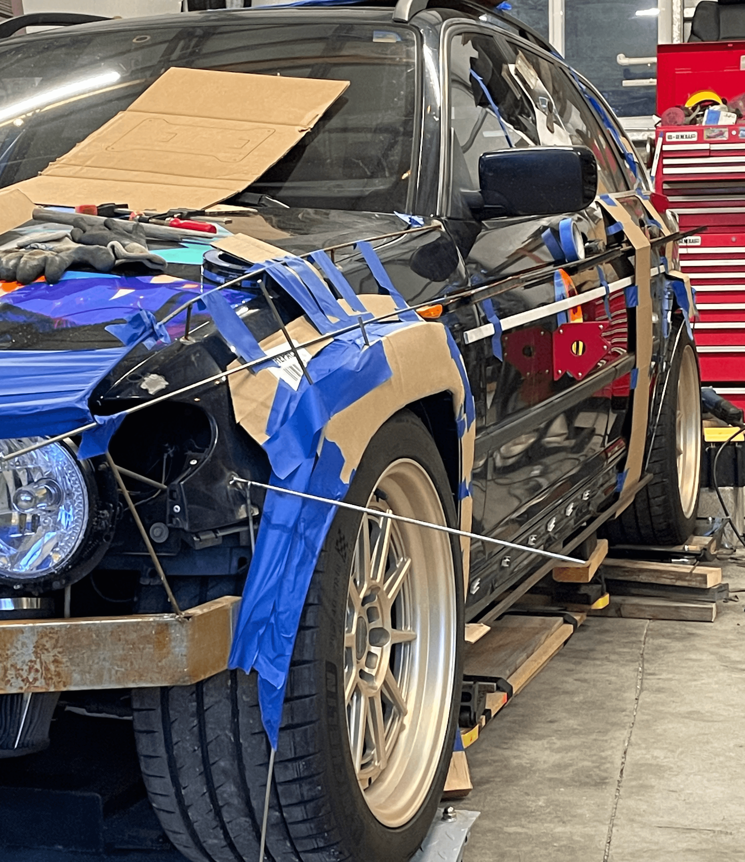 As I write this, we’ve got a couple designers ironing out details with pencil and paper, and I’m hard at work with some of my favorite tools of wireframe, tape, and cardboard on the actual car to see how it sits with me. As details fall into place, I will build a metal wire framework on the prototype to provide the structure for composite bodywork.